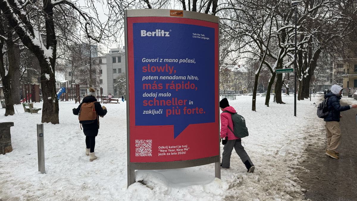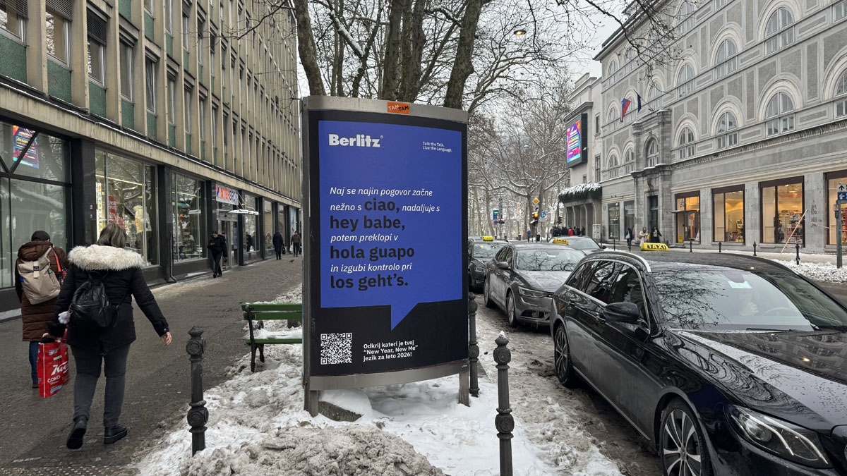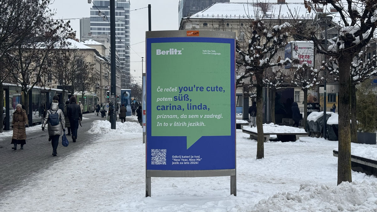 The campaign appeared on digital LPP screens and TAM-TAM posters in central Ljubljana, as well as on jumbo billboards in central Maribor. It was also supported by digital advertising, leaflets and guerrilla stickers. Posters and video content included a QR code that led to a prize draw for a free language course at Berlitz.